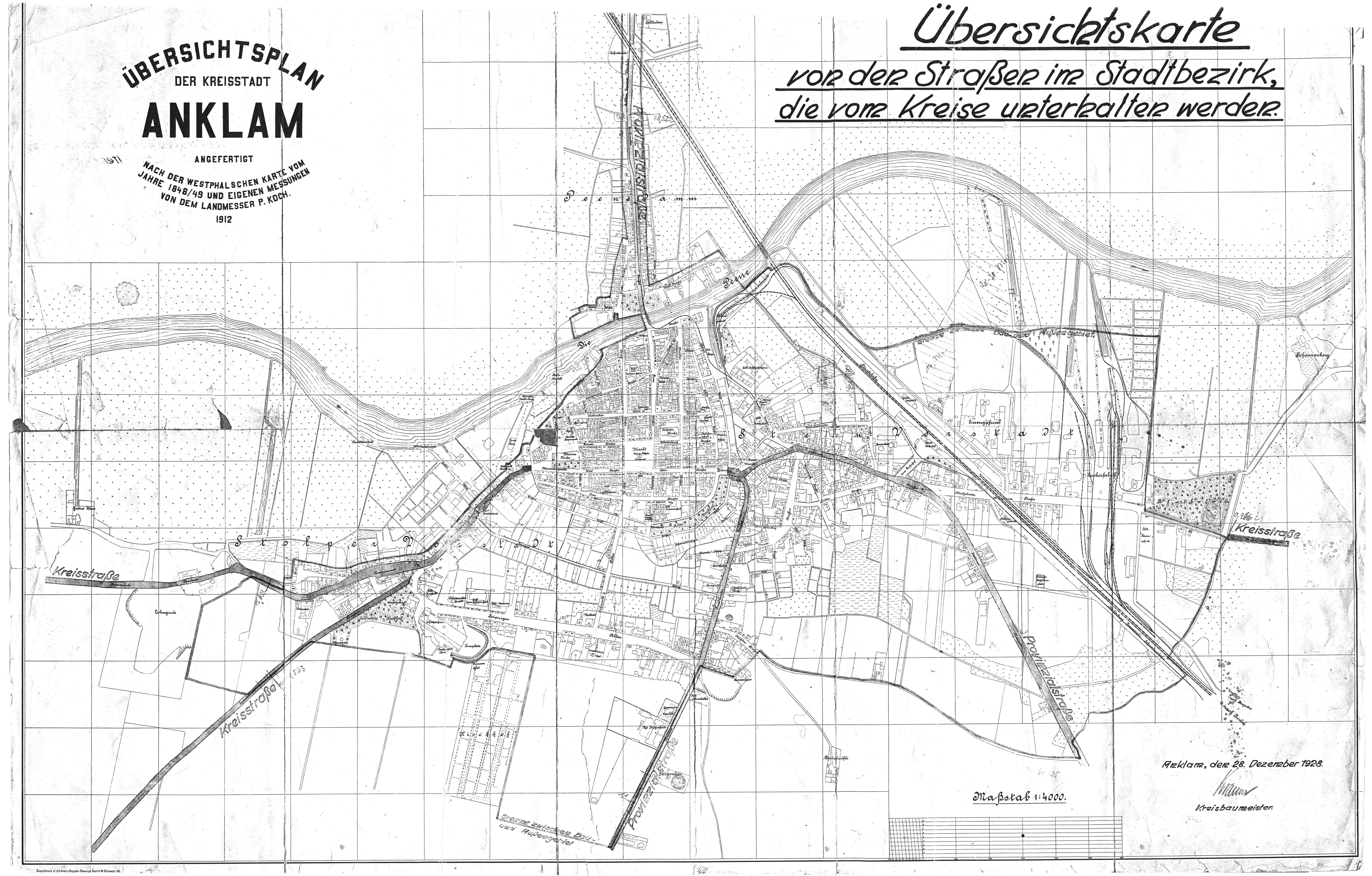 Übersichtsplan der Kreisstadt Anklam Angefertigt nach der westphalschen Karte vom Jahre 1848/49 und eigenen Messungen von dem Landmesser P. Koch 1912 mit Eintragungen von 1928: Übersichtskarte von den Straßen im Stadtbezirk die vom Kreise unterhalten werden. M1: 4000, enthält auch Grundstücke und Hausnummern
